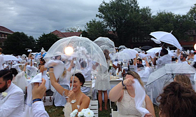The 2015 Philadelphia Diner en Blanc is sure to be remembered as one of the most exciting and unpredictable gatherings since Kayli Moran and Natanya DiBona brought this Parisian tradition to our city. The evening started with a mist and heavy drizzle while thousands gathered in groups around Center City decked in their party white lugging their tables and chairs and picnic baskets along - determined to have a good time in spite of the weather. The drizzle turned into a steady rain as the participants arrived at the secret Navy Yard location, and then erupted into a full out down pour as the elegant dining began. Umbrellas and ponchos were the must-have accessory of the evening, but the added elements could do nothing to deter the 4.500 who had gathered for a lawn party with friends, acquaintances, and lots and lots of total strangers. Our favorite people to watch were those who never bothered to shield themselves from the rain and continued to sit in full fancy dress, eating their baguettes and shrimp cocktails, making casual conversation as if there was absolutely nothing unusual about sitting in a storm to dine. As the rain began to clear, the masses got up to dance, socialize, and shake off their wet clothes. The meal ended with the raising of 4,500 sparklers to the night sky letting the city know that in spite of the weather, Diner en Blanc was still there, still having the evening of their lives, and still the envy of the 30.000 people on the waiting list who hope for a chance to attend in 2016 (we know we want to be there!).
